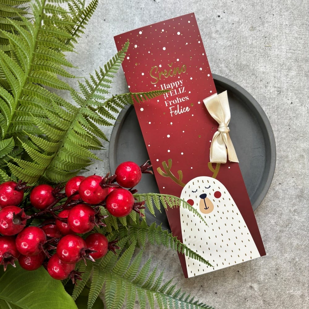Ta posebna praznična izdaja je zavita v elegantno darilno embalažo z ljubkim severnim medvedkom in zlatim napisom v različnih jezikih, kar ji daje dodatno toplino in praznično čarobnost. Popolno za obdarovanje sodelavcev, prijateljev, družine ali kar sebe.