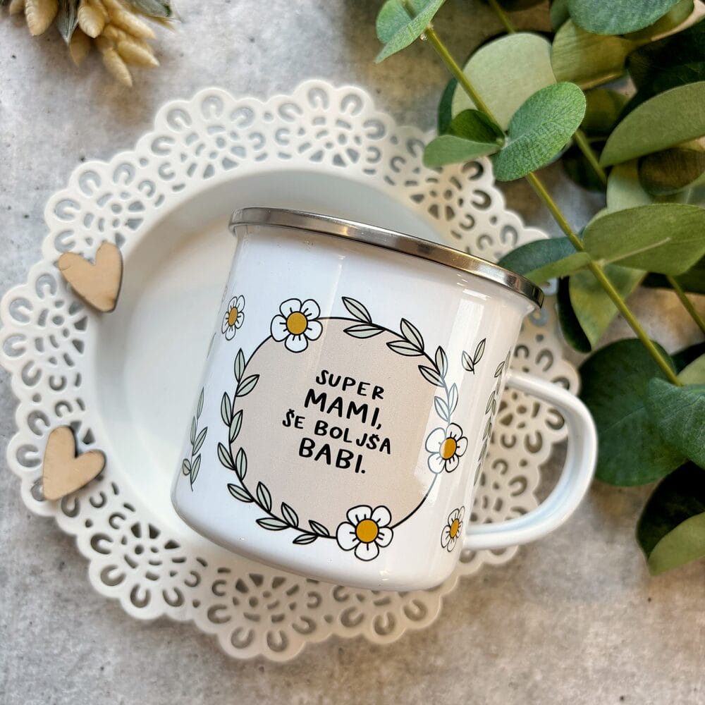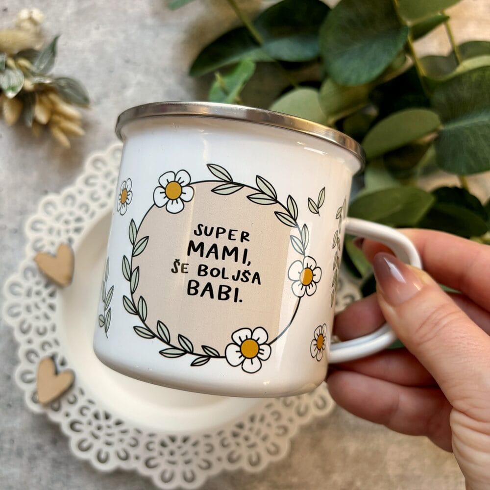 Ta emajliran lonček je majhna pozornost z velikim sporočilom. Z napisom »Super mami, še boljša babi« je čudovito darilo za mamo ali babico – ob materinskem dnevu, rojstnem dnevu ali kar tako, da jo spomnimo, kako zelo jo imamo radi.