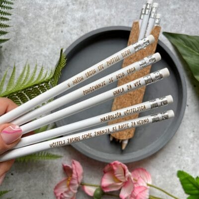 Komplet petih svinčnikov s prisrčnimi sporočilci, je darilo za učiteljico, na katerem se zagotovo ne bo nabiral prah. Izbrala sem najlepše reke in jih sestavila v simpatičen kompletek. Saj veš, svinčnikov ni nikoli dovolj, če pa si učiteljica pa najbrž to še toliko bolj drži!