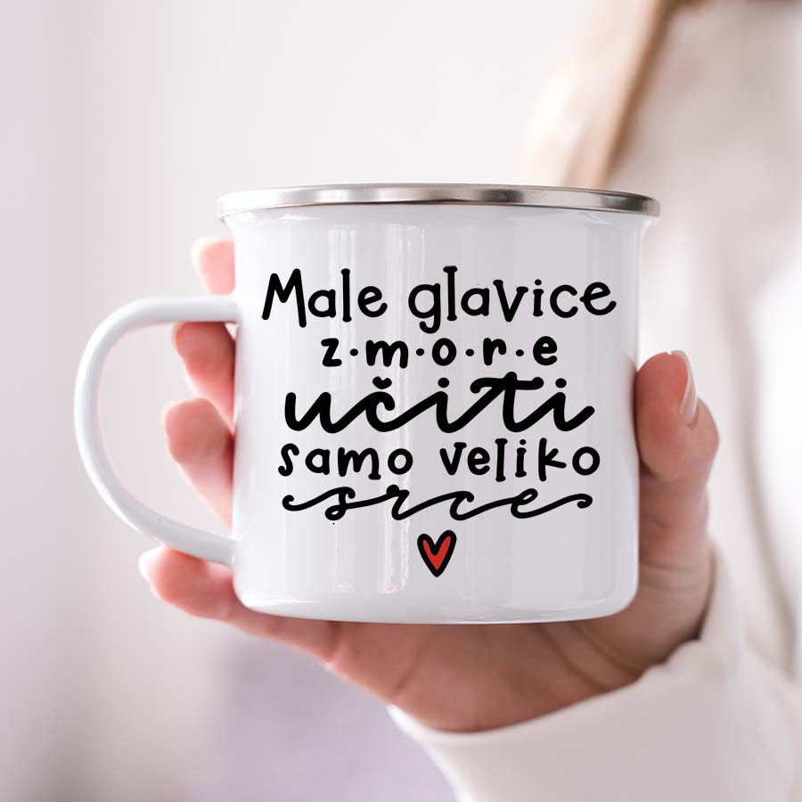 Čudovito darilo za vzgojiteljico ali učiteljico ob zaključku vrtčevskega in šolskega leta. Potiskan emajliran lonček, motiv: Male glavice zmore učiti samo veliko srce. Drobna pozornost s katero izkažemo hvaležnost.