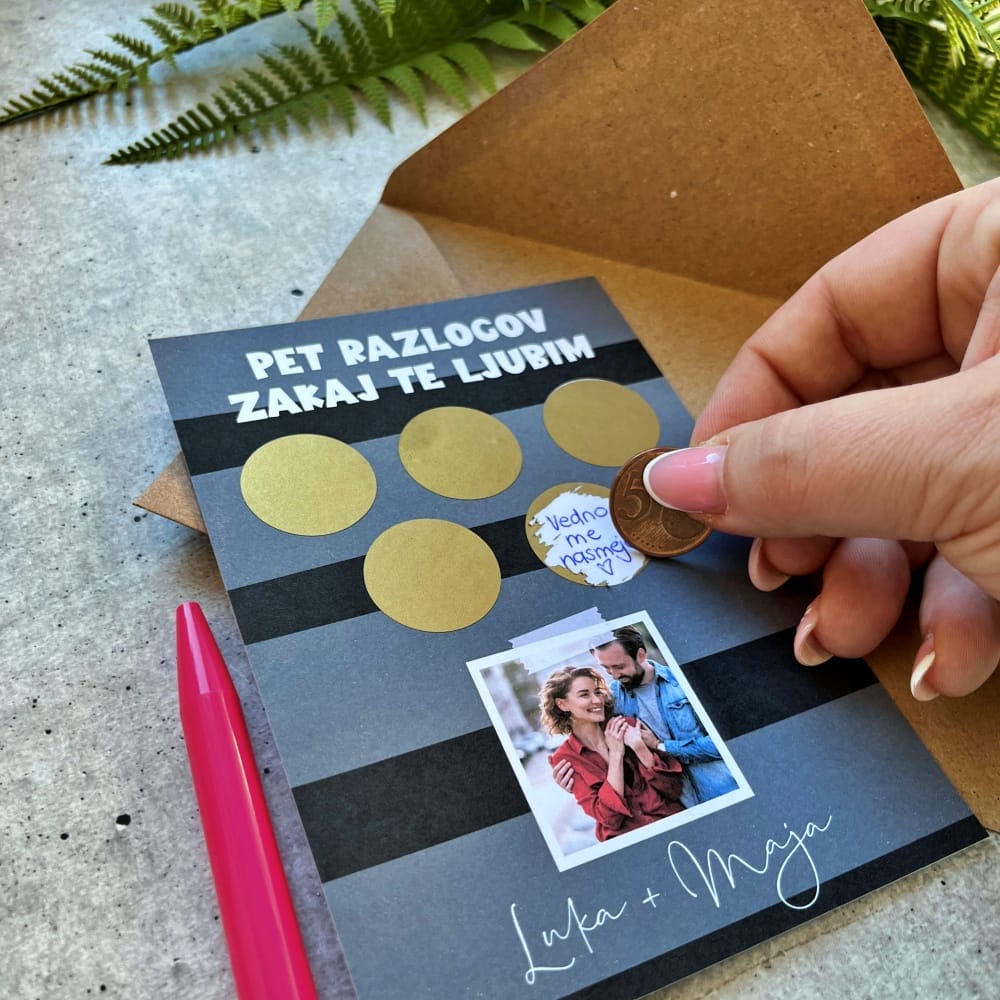 Kartica 5 razlogov zakaj te ljubim je lahko simpatično darilo za valentinovo, obletnice ali pa kar tako, za lepši dan. Na njej so prazni prostori, v kateri po želji vpišete napis in ga prelepite s priloženimi nalepkami. Obdarovanec premaz podrgne in prikaže se sporočilce.